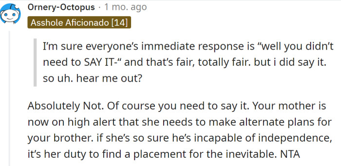 Redditor Tells Her Mother She Won't Take Care Of Her Autistic Brother When She Dies Because It's A Burden