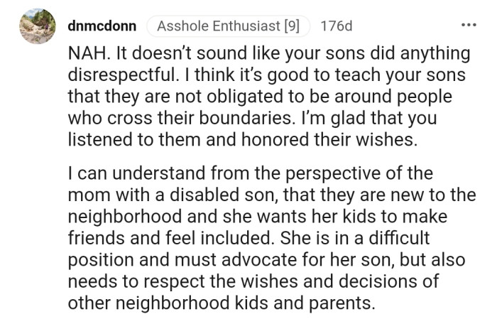 The commenters have applauded OP for listening to his sons' wishes rather than forcing them to accommodate someone they don't feel comfortable playing with. Perhaps Aiden's mom needs to spend more time helping him control his flails so that he can more easily assimilate with the other kids.