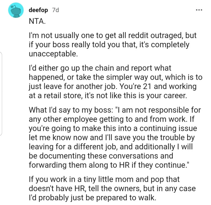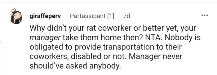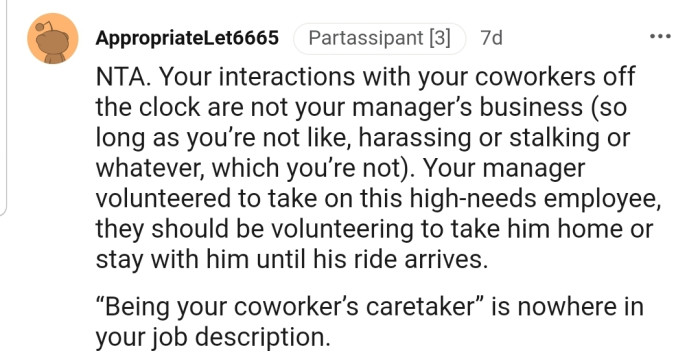 Reddit.comOP explained that she has an autistic coworker whose mum brings him to work and drives him home regularly
