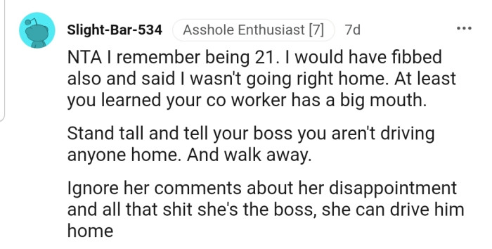 One Redditor found herself in such a situation after lying to avoid driving a disabled coworker home.