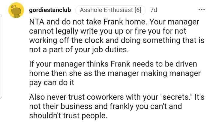 "If your manager thinks Frank needs to be driven home, then she, as the manager making manager pay, can do it."