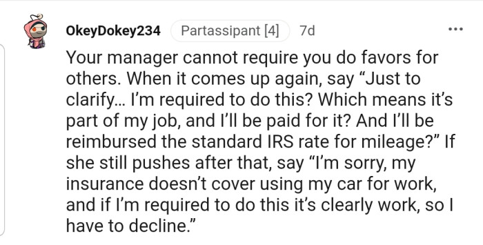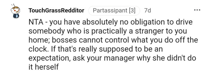 "Stand tall and tell your boss you aren't driving anyone home. Then walk away."