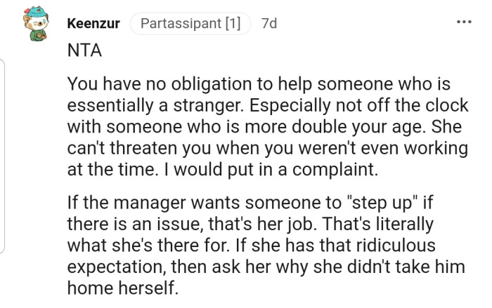 Reddit.comUnfortunately, last week, Frank's mum was delayed in picking him up. Even after the manager tried to find a solution, no one was willing to drive Frank home, including OP.