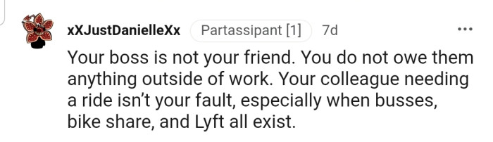 "Your boss is not your friend. You do not owe them anything outside of work."