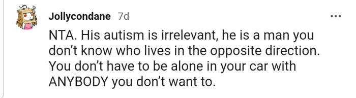 From the comments, it's clear that OP has overwhelming support from the Reddit community. They understand why she was uncomfortable with a stranger in her car and being forced to cater to someone else when she needed care for herself.