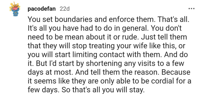 Establishing clear boundaries is crucial when dealing with challenging in-law dynamics.