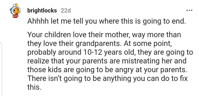 "At some point, probably around 10-12 years old, your kids are going to realize that your parents are mistreating her, and those kids are going to be angry at your parents."
