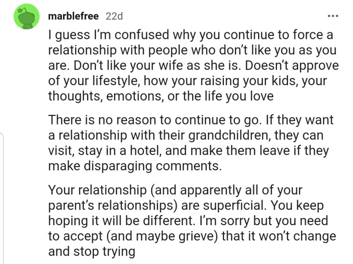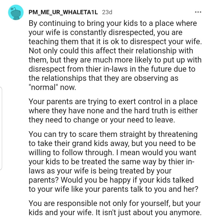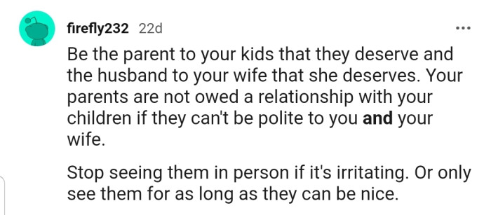 "Your parents are not owed a relationship with your children if they can't be polite to you and your wife."