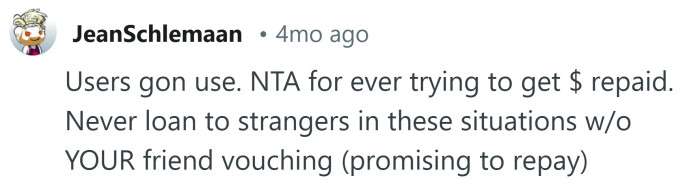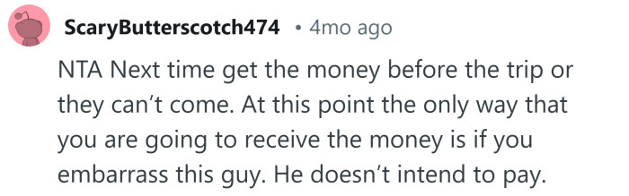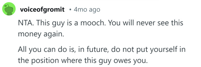 In the end, the OP wasn’t asking for anything outrageous — just the money he fronted. Whether the guy pays or keeps dodging, the Redditor’s learned that even small debts can reveal big red flags.