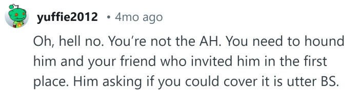 With the credit card bill looming, the OP explained the urgency, only to be hit with the baffling question: “You can’t pay it off yourself?” The Redditor tried to remain calm, offered more time, and avoided telling his friend about the issue due to a recent tragedy in their circle.