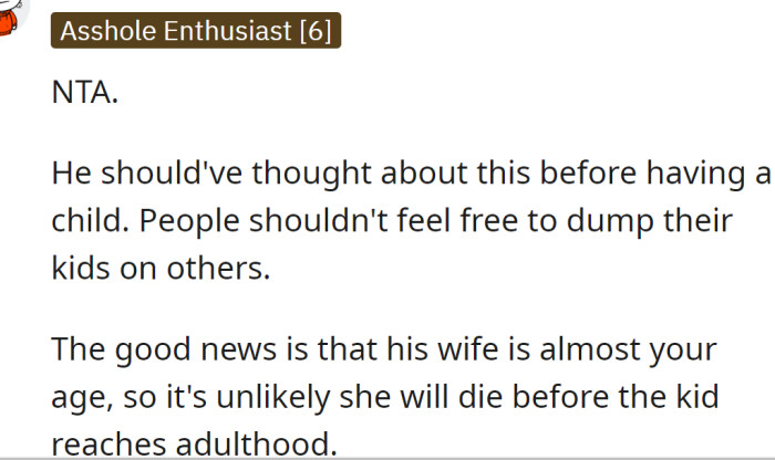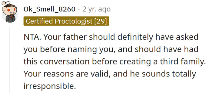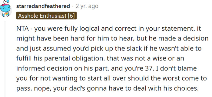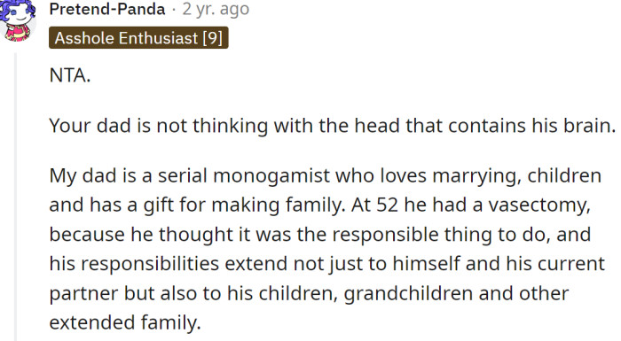 When the father insisted that he needed assurance his child would be cared for due to his age, the OP told him that having a baby at his age was not a wise decision. This remark strained their relationship. Questioning a parent's decision to have a child at an advanced age often reflects deeper concerns about family dynamics and responsibilities. Research in developmental psychology highlights how parenting in later years can evoke mixed feelings, particularly regarding the child's well-being and the parent's capability to provide adequate support. The daughter's apprehension may stem from fears about her father's ability to fulfill parental obligations at an age where energy and health can be concerns. Studies show that children of older parents may face unique challenges, prompting valid concerns regarding the dynamics of caregiving and support within the family. Research in developmental psychology indicates that parenting at an older age can present unique challenges and concerns. Studies show that older parents may face increased anxiety about their ability to provide for and connect with their children, particularly in the context of societal expectations. According to experts, these concerns can lead to conflicts about parenting roles and responsibilities. Expressing doubts about parental decisions often evokes strong emotional responses, including worry and frustration. As noted by Dr. John Gottman, a renowned marriage researcher, "When concerns are not acknowledged, it can lead to increased anxiety and conflict within families." The daughter's response may reflect a protective instinct towards her family, driven by a desire to ensure the best for both her father and the new child. Addressing these feelings through open communication can help bridge the gap between generational perspectives, fostering understanding and compassion, as emphasized by Dr. Dan Siegel, a child psychiatrist who states, "Effective communication is key to nurturing healthy family dynamics." Furthermore, the concept of 'generational conflict' often emerges when older parents make choices that younger family members may question. According to Dr. Michael Thompson, a child psychologist, "Generational differences can lead to misunderstandings, especially when it comes to parenting decisions." Research from his work emphasizes that differing values and life experiences can create tension within families, particularly regarding decisions about child-rearing. These tensions can be exacerbated by the high stakes involved in parenting. Engaging in discussions about significant family decisions requires sensitivity and understanding. Research indicates that open communication about differing perspectives can facilitate better understanding and conflict resolution. The daughter may benefit from expressing her concerns in a respectful manner, ensuring that her father feels heard while also addressing her own emotional needs. Encouraging a dialogue that values both perspectives can lead to a more constructive outcome, promoting familial harmony. Experts recommend fostering open dialogue about differing perspectives on parenting. Using 'I' statements to express concerns without placing blame can help facilitate constructive conversations. Research supports that families who communicate openly about their differences are more likely to resolve conflicts amicably. Practicing active listening can enhance the quality of family discussions. Studies show that active listening fosters empathy and connection, enabling family members to engage in meaningful conversations. The daughter can create a safe space for her father to share his motivations and feelings about becoming a parent again, which could help alleviate her concerns and strengthen their bond. By fostering an environment of empathy, families can navigate challenging discussions more effectively and build trust. Additionally, engaging in family therapy can provide a safe environment for exploring generational conflicts. Studies show that therapy can enhance understanding and empathy among family members, leading to improved relationships. Through therapy, families can develop strategies to address conflicts constructively. Emotional intelligence is crucial in navigating the complexities of parenting, particularly across generations. Understanding one's emotions and those of others can facilitate healthier interactions and reduce conflict. Research in emotional intelligence shows that higher levels are associated with better parenting outcomes and family dynamics. Moreover, practicing empathy and active listening can create a supportive environment for discussing parenting decisions. Studies indicate that families that engage in empathetic communication tend to experience greater satisfaction and cohesion. This approach can help bridge generational divides and foster mutual understanding. Redditors supported the OP, stating that she was not in the wrong for refusing to commit to another responsibility when she already had plenty of her own. Her father should have thought about having a baby at his age earlier. He can't manipulate her into taking care of his child. He should have asked her before naming her in his will as guardian and respected her wishes. This situation highlights the challenges that arise when differing generational perspectives on parenting come into play. Recognizing and addressing these differences is essential for fostering understanding and cooperation within families. Analysis generated by AI In summary, navigating the complexities of parenting across generations requires understanding, communication, and emotional intelligence. Research consistently shows that fostering open dialogue and empathy can lead to healthier family dynamics and conflict resolution. This situation illustrates the emotional complexities surrounding parental decisions, particularly regarding age and responsibility. It's common for children to feel protective of their pa