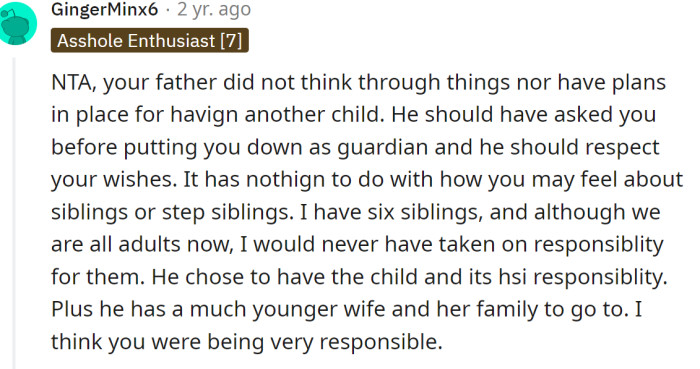 RedditThe OP and her husband are named as guardians for siblings from the father's second marriage: