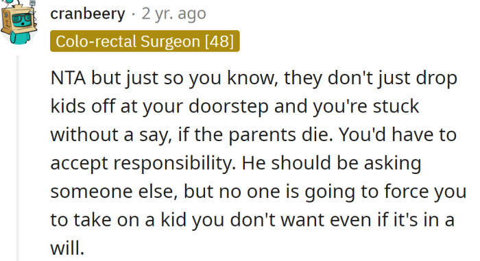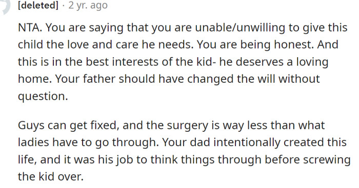 "No one is going to force you to take on a kid you don't want even if it's in a will."