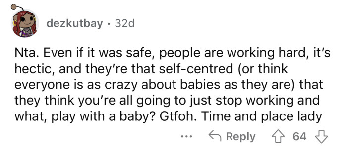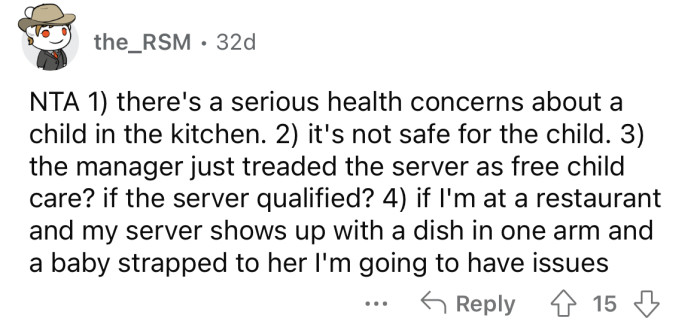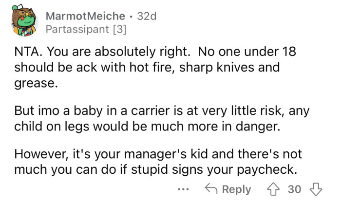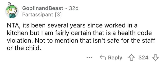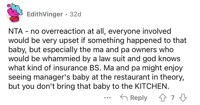 The OP asked her if it was really the best place to bring her baby, but there wasn't much she could do, considering the woman was her manager. The Redditor says she doesn't think a restaurant kitchen is an appropriate place to bring an infant.