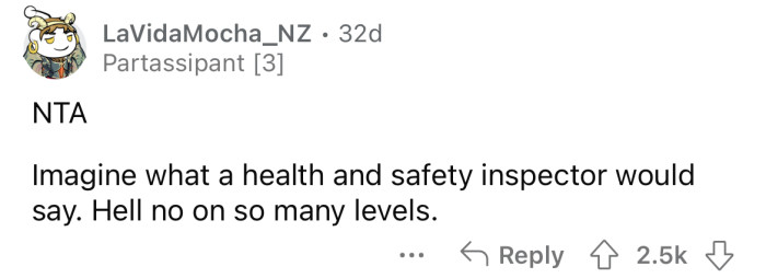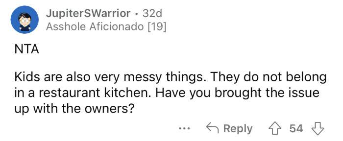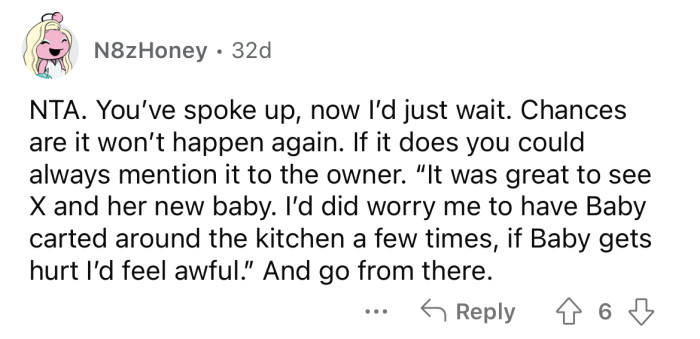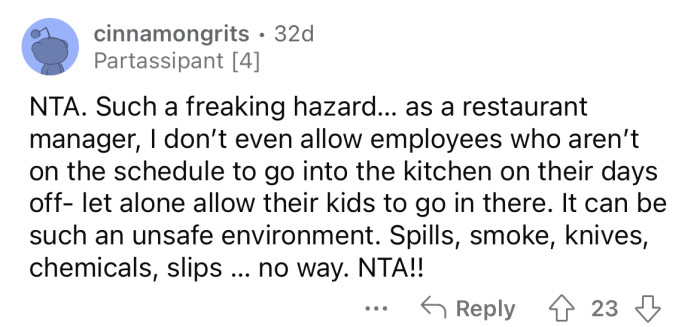 Reddit/light_flowersThe OP immediately told her that she couldn't bring an infant into the kitchen because it's a dangerous environment.