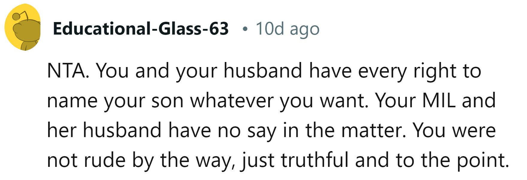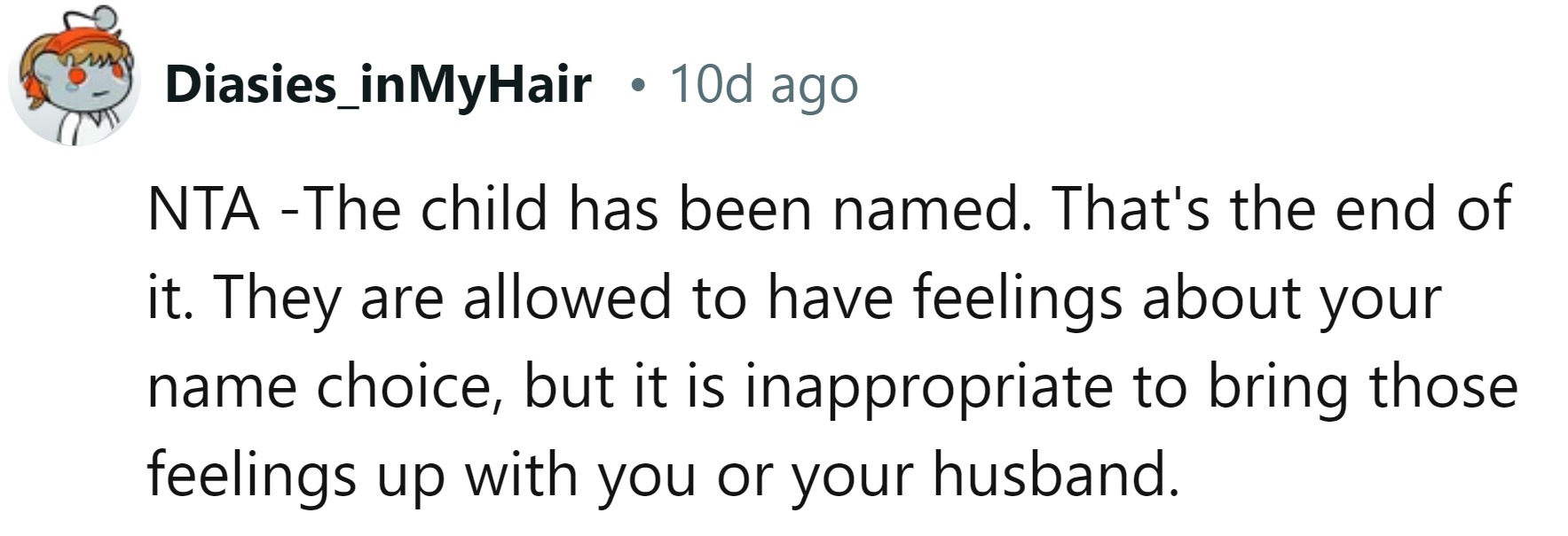 What are your thoughts on this situation? Was the OP being disrespectful to her in-laws by reacting the way she did, or were they out of line for commenting on the baby's name?
