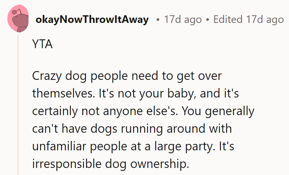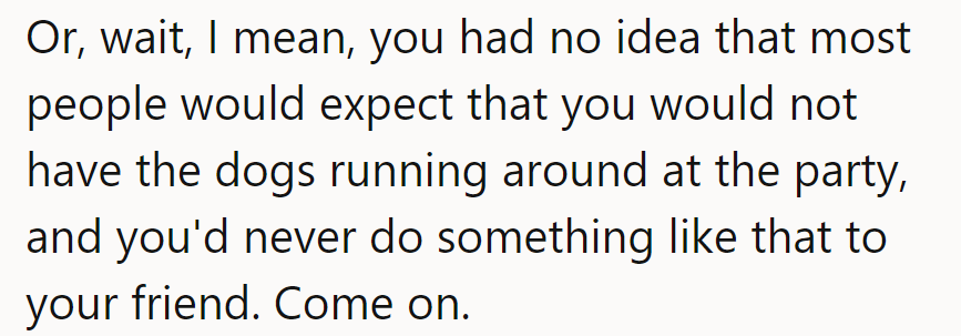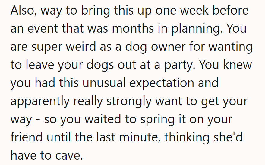 "You are super weird as a dog owner for wanting to leave your dogs out at a party."
