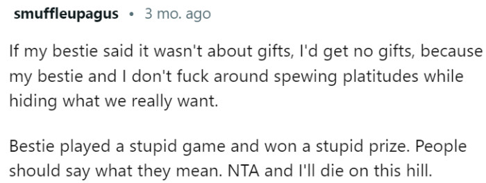 This Redditor's decision to forego a gift might be interpreted as a rejection of these social norms, possibly leading to feelings of alienation or judgment from peers.