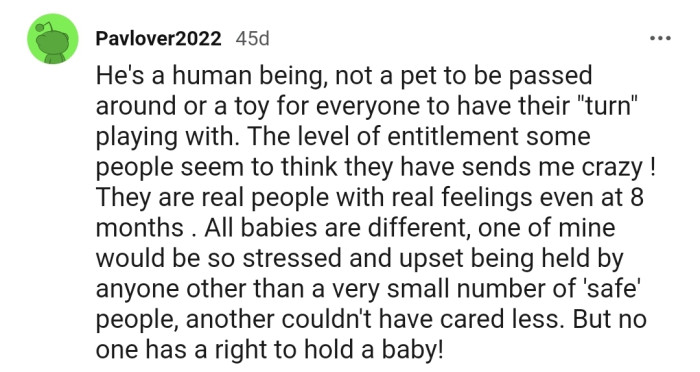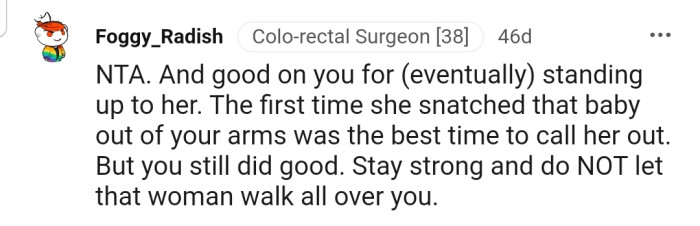 As if that weren’t enough, she went on to parade the baby from person to person. This stirred a mix of emotions in OP's mind—the foremost being the disgust of having her baby snatched without her consent.