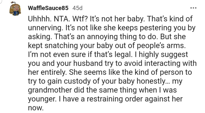 One weekend, OP and her husband found themselves at a family event, surrounded by their extended families. The husband's grandmother took an audacious step by snatching OP's baby from her arms without so much as a request.