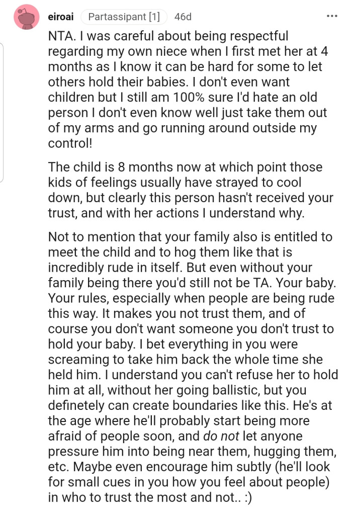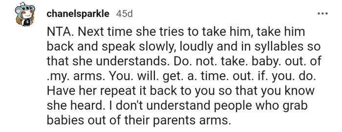 "NTA...I don't understand people who grab babies out of their parents' arms."