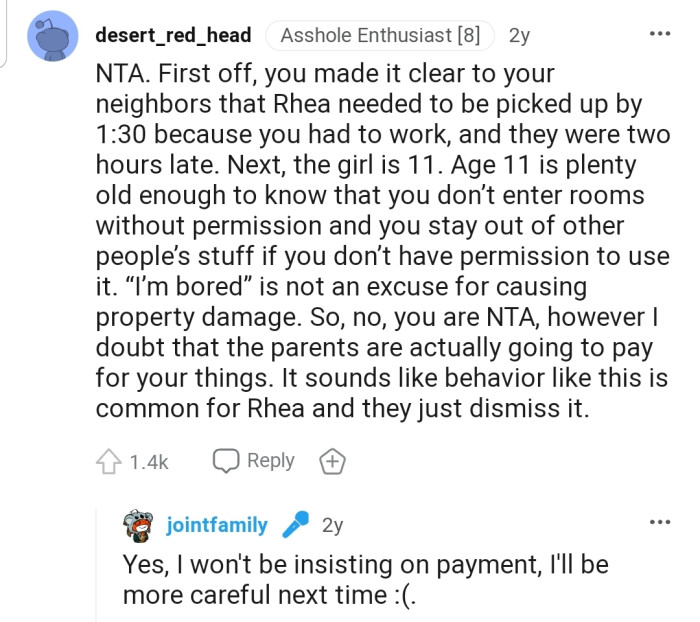 In addition, the commenters suspect that Rhea's upbringing is poor, as her behavior is unusual for an 11-year-old. Thankfully, OP and Rhea's mom were able to resolve things amicably.