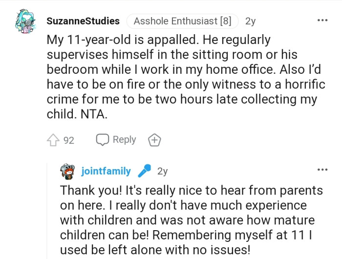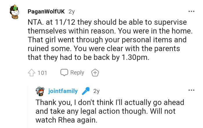 The Reddit community is solidly behind OP on this matter. They have reiterated that Rhea's parents violated the agreement by keeping their daughter past the time that OP was available.