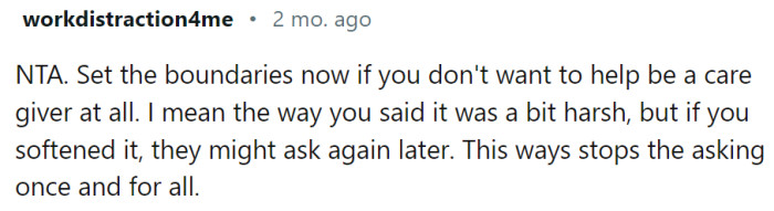 "Set the boundaries now if you don't want to help be a caregiver at all"