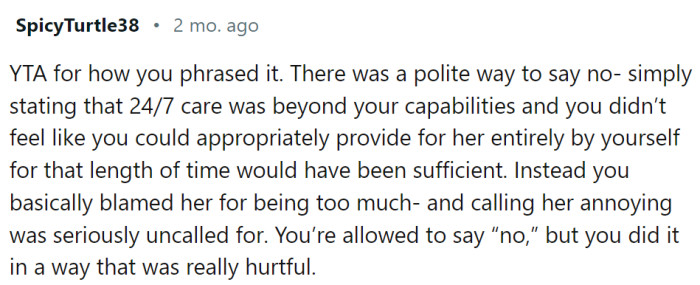 She explains her decision bluntly, describing Alice as "a handful" and "annoying," and stating that she didn't want to spend her week caring for a child with special needs. This response shocks Marcus and his parents, and it angers OP's parents.