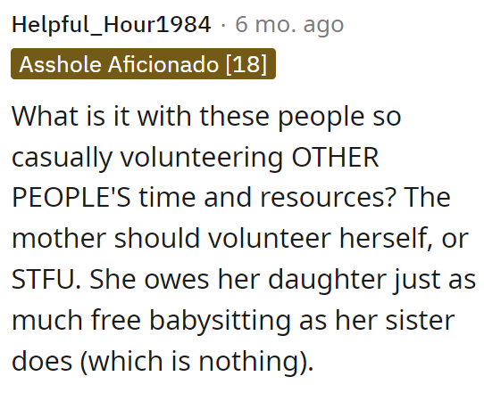 Her refusal is not without an offer of support; she proposes financial assistance for hiring a babysitter. Yet, this alternative is dismissed by her sister, who, along with their mother, labels her as selfish for not acquiescing to the request.
