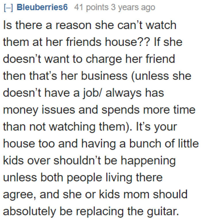 He isn't comfortable letting those children run around their home. Despite the OP's request, the girlfriend still doesn't inform him, and one day, he sees one of the kids playing with his now-broken guitar.