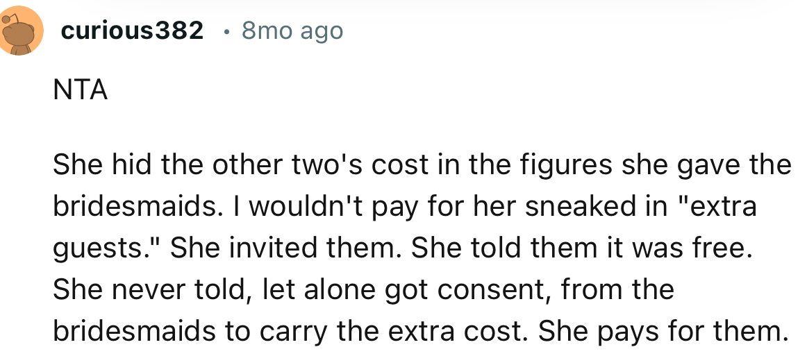 The bride suggested splitting the cost three ways, strategically excluding her mom and aunt, but OP wasn’t having it. She fiercely waved the fairness flag, and Bestie's response? A mix of incredulity and accusation, branding OP as a "bad friend" for daring to question the financial dynamics.