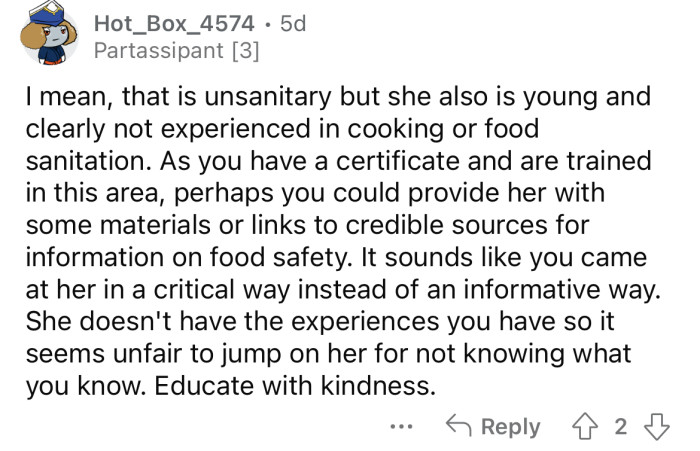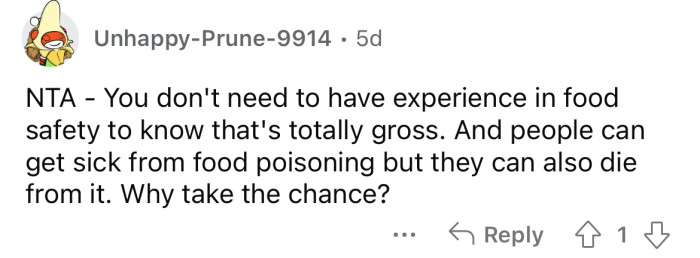 However, the following day, when the OP went to the freezer to get some fruit out for a smoothie, she was shocked to see that Dina had put the open package of meat back into the freezer. Of course, re-freezing thawed meat is never a good idea, and the OP has a certificate in food safety and preparation, so she was fully aware of how dangerous doing so could be.