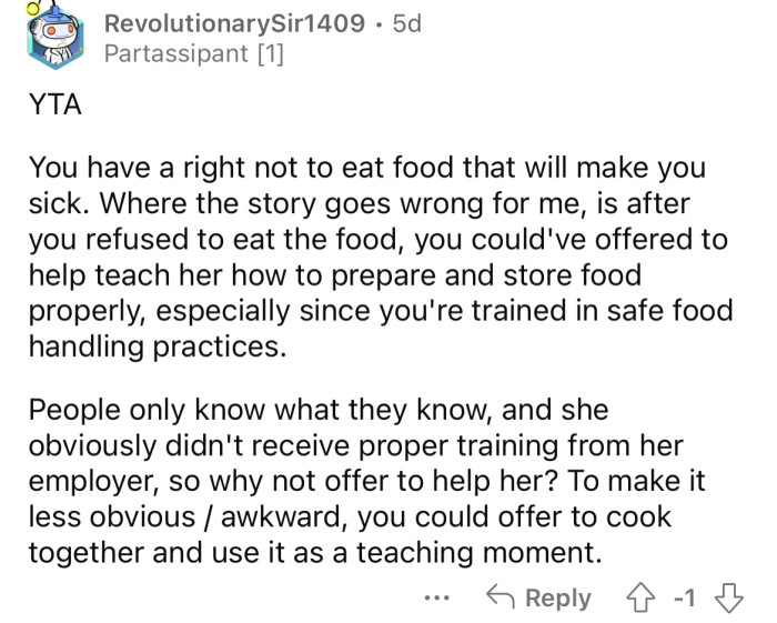 Later on, Dina mentioned again that she wanted to cook something for them to share. When the OP declined, Dina questioned her, and she eventually had to tell her the reason was her lack of food safety knowledge.