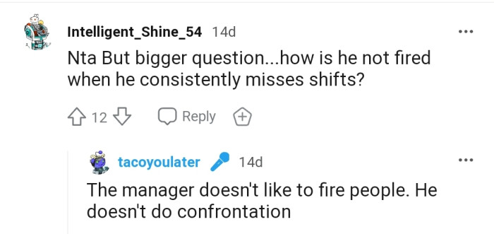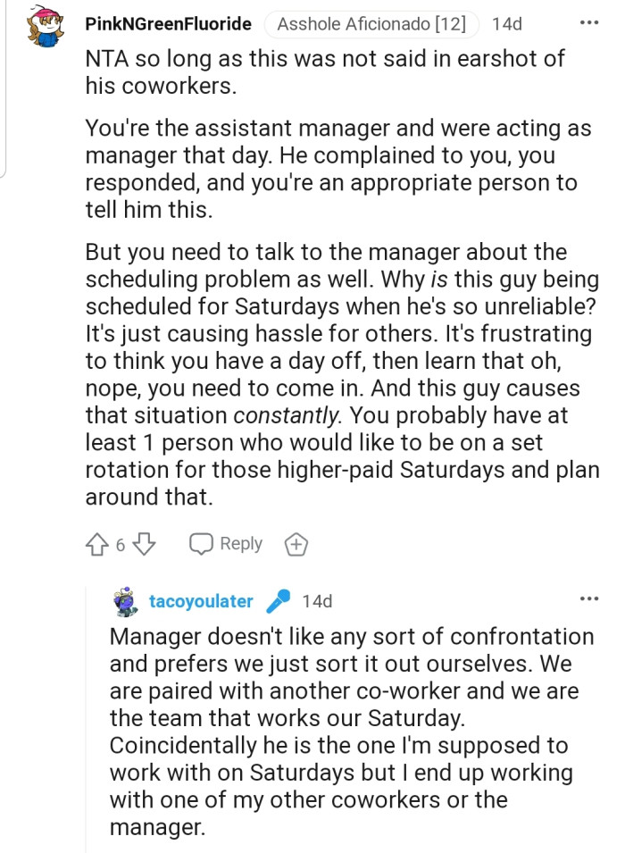 In an unforgettable moment, OP bluntly pointed out the missing puzzle piece: our grumbling coworker's absence during the highly coveted Saturday shifts.