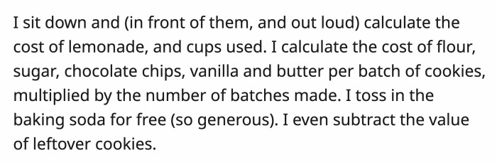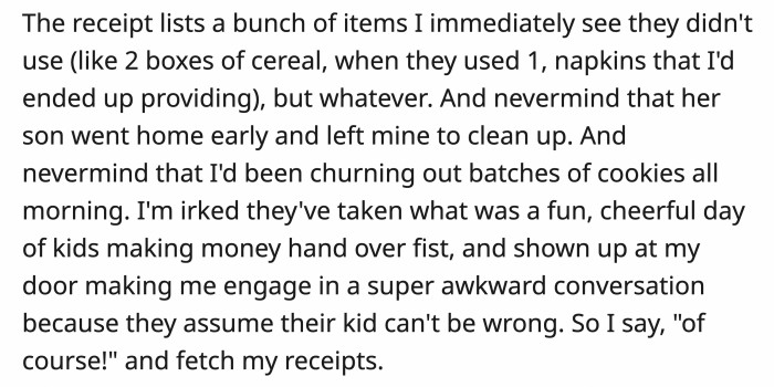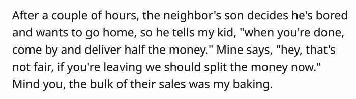 Most of what they were selling was baked by OP, but the neighbor's kid didn't care and insisted they split everything 50/50