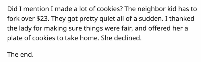 OP made a lot of cookies, and by the end of her computation, the neighbor's kid owed OP $23. Everyone was quiet, and OP thanked the mom for making sure everything was handled fairly.