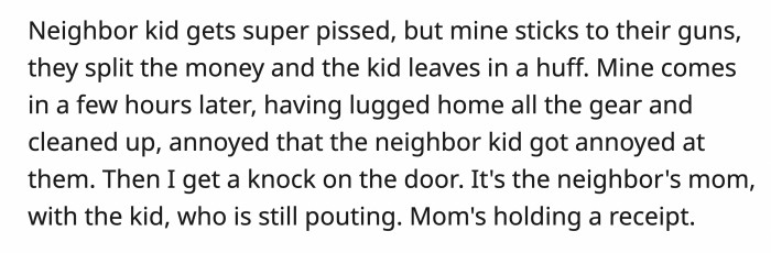 The kids earned a lot of money, and OP loved seeing them learn about hard work and getting excited about their success. All was going well until the neighbor's kid got bored after a few hours.