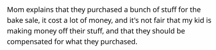 The mom explained that she brought a bunch of items the kids used for their bake sale. It cost her a lot of money, and it was unfair that OP's kids were making money off of what they bought.