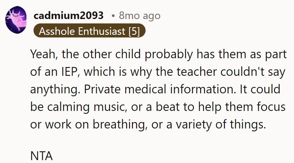 The father sided with the teacher, believing there must be a valid reason the other student was allowed to use AirPods, possibly due to an Individualized Education Program (IEP) or another special arrangement. He felt it was important to teach their son to respect authority and not challenge teachers in front of other students.