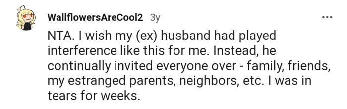 "NTA. I wish my (ex) husband had played interference like this for me. Instead, he continually invited everyone over"