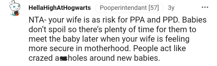 OP's decision to prioritize their wife's mental well-being and protect their newborn from undue stress resonated strongly with the Reddit community.