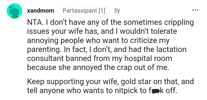 Reddit.comOP kicked out the lactation consultant and their dad after they tried pressuring their wife to consider breastfeeding