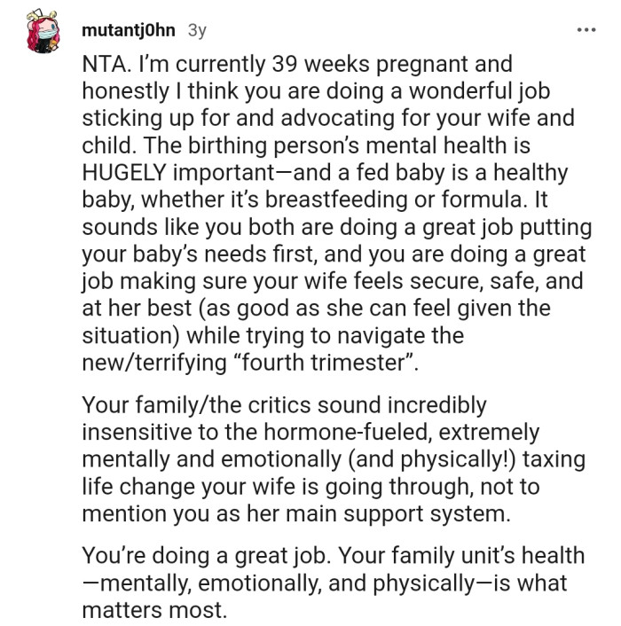 They applauded OP for taking a stand against their family members who failed to recognize the importance of respecting their wife's choices and nurturing her self-confidence as a mother.