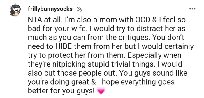 "NTA at all. I’m also a mom with OCD & I feel so bad for your wife. I would try to distract her as much as you can from the critiques."