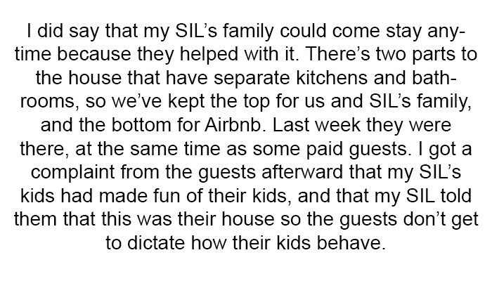 In gratitude, she promised her SIL's family they could stay at the house "anytime," a gesture that underscored the collaborative spirit of the renovation. However, the dynamics shifted when her SIL’s family's recent stay overlapped with that of paying Airbnb guests.