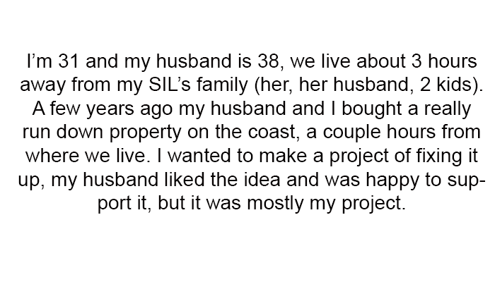 A 31-year-old woman finds herself at the center of a family dispute over the use of a beach house that she painstakingly renovated into a dual-purpose vacation and rental property. The property, a labor of love, was transformed from a rundown state into a beautiful retreat with the help of her sister-in-law (SIL) and her family.