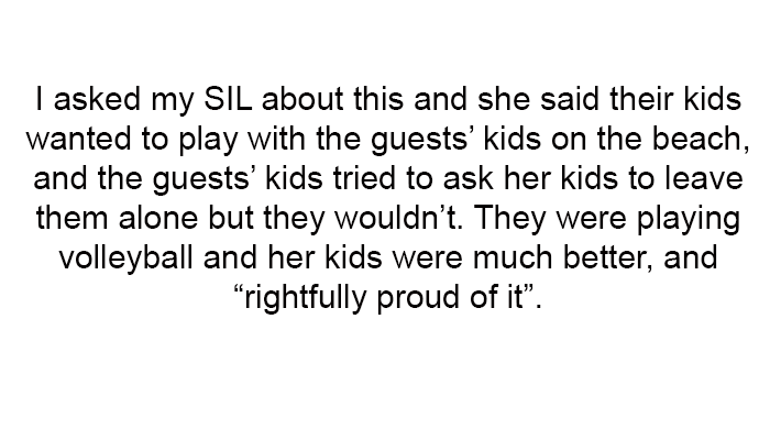 Complaints from these guests about the SIL’s children’s behavior sparked a confrontation. The accusations that her SIL’s children disrupted the guests' experience and asserted ownership over the property led to a heated argument.
