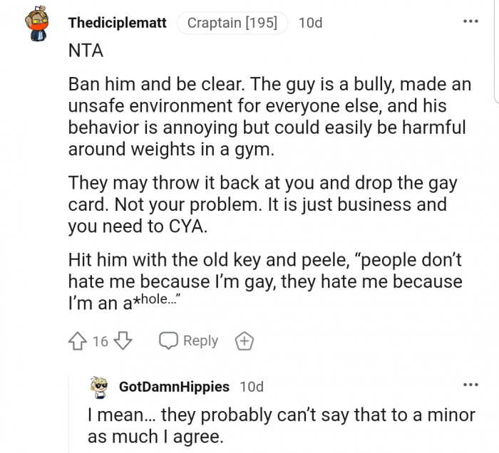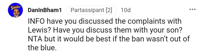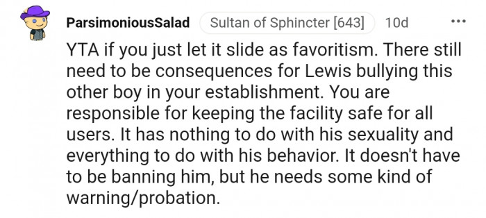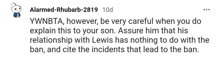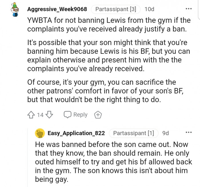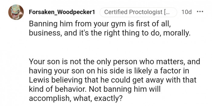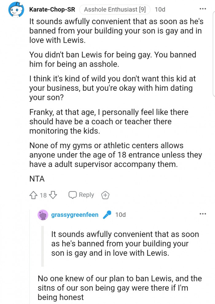 grassygreenfeenOP explained that they decided to ban Lewis because he was bullying another boy at their athletic center. However, they were worried that their son would take it the wrong way, as he had just come out as gay and revealed that Lewis was, in fact, his boyfriend.