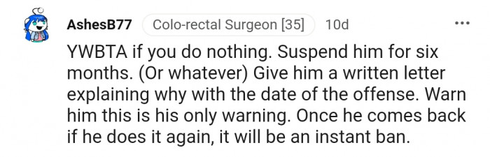"YWBTA if you do nothing. Suspend him for six months (or whatever)"